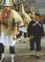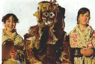and Tuesday after the last Sunday in January. Dressed in white petticoats over blue trousers, sandals, and sheepskins, all topped by a cone-shaped, multi-coloured